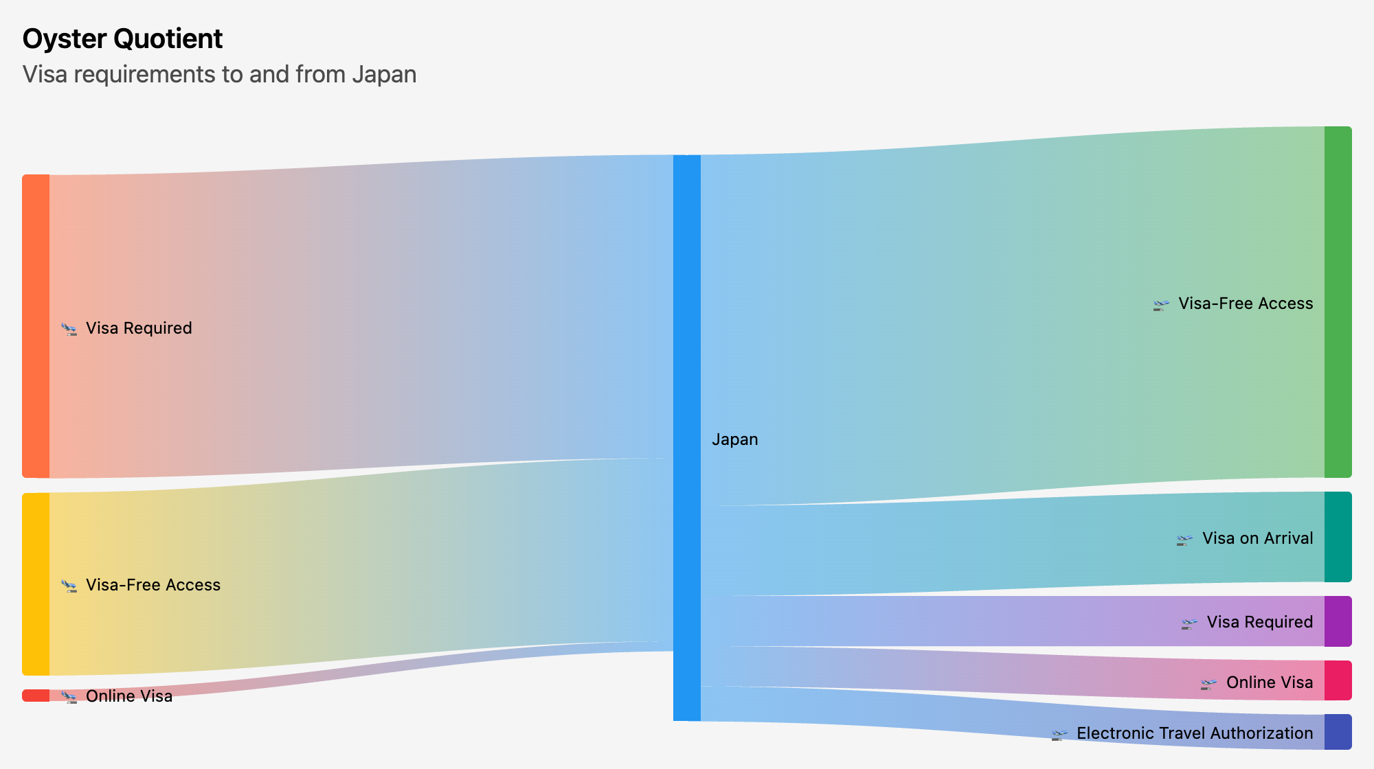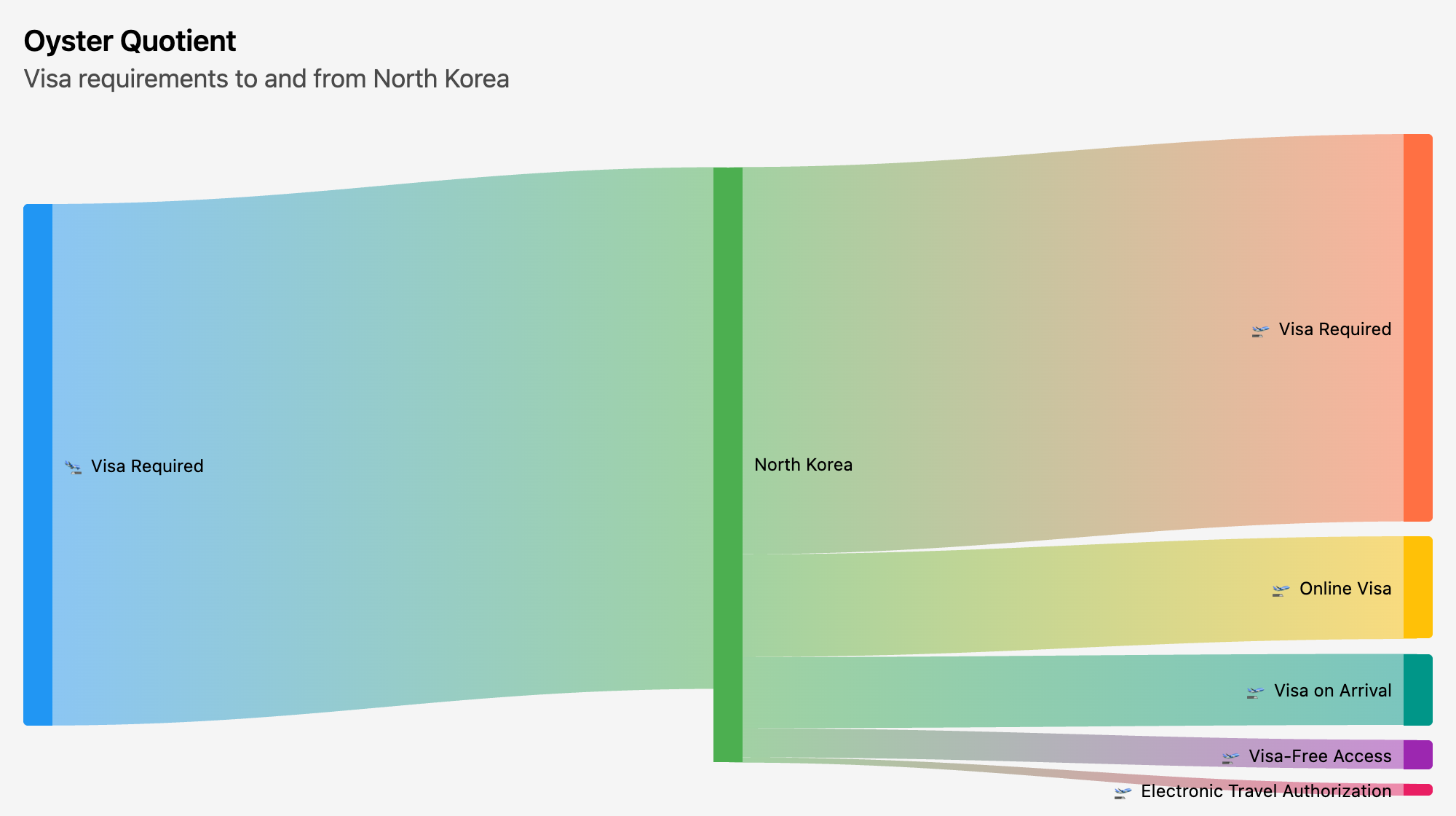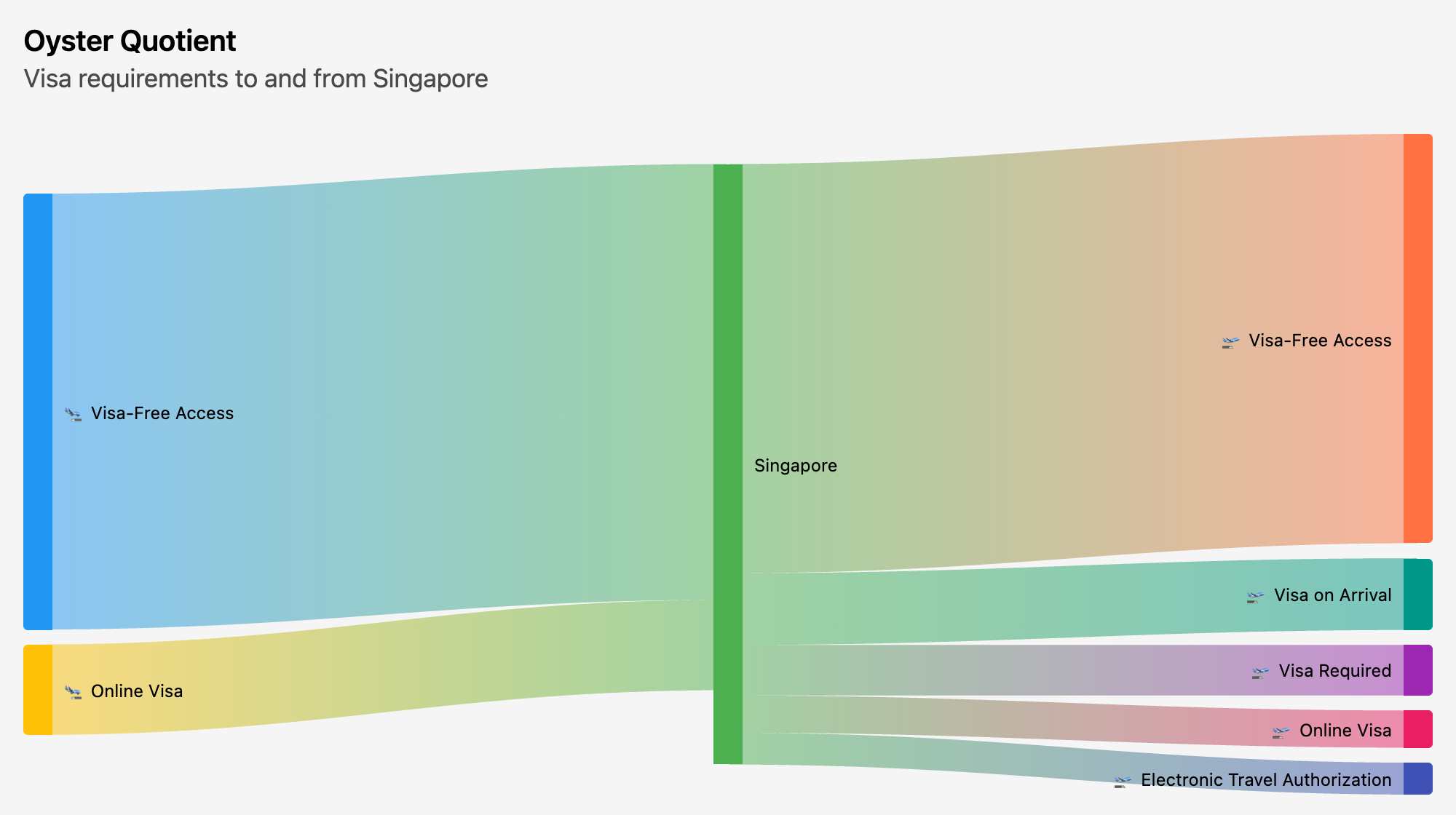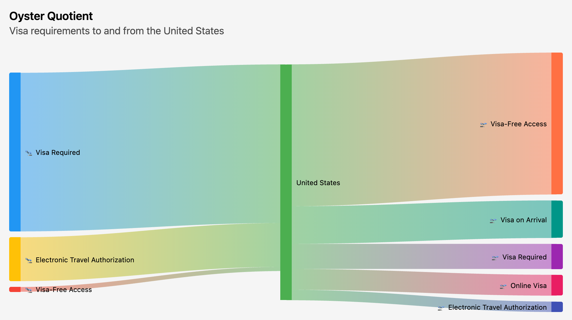 In the end, I thought it would be interesting to see the juxtaposition of what kind of access was granted to a given passport next to what that same country required of other passport holders. I also thought the Sankey flow diagram made for an interesting visual representation.