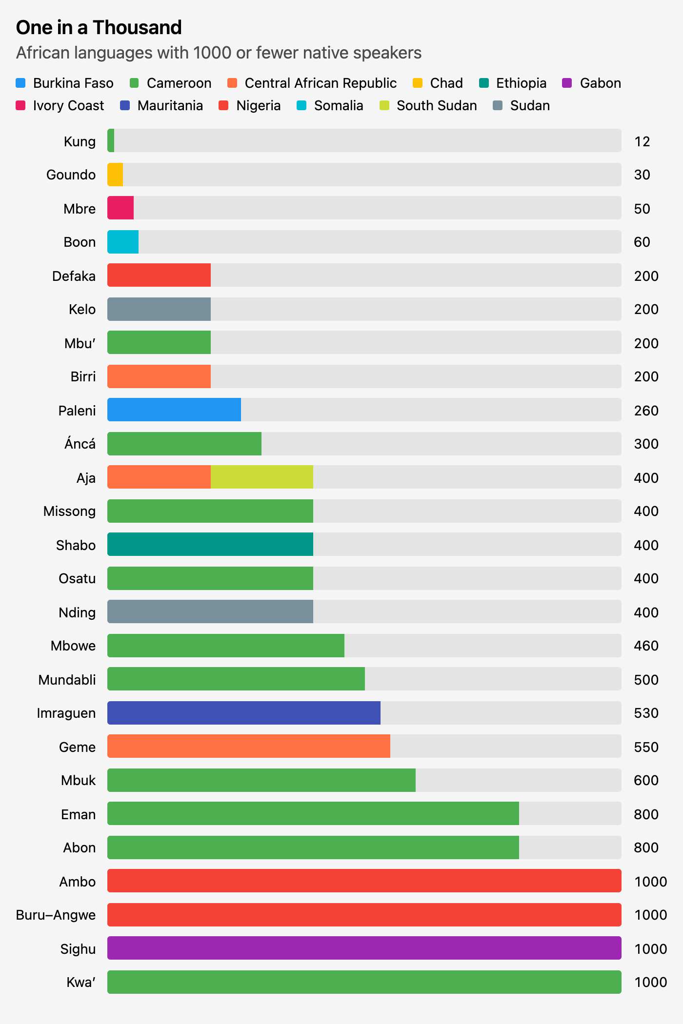 I took a lot of different stabs at this one before landing on an approach. I tried a scatter plot looking at total number of speakers versus number of countries for each language, across all… *(checks notes)*