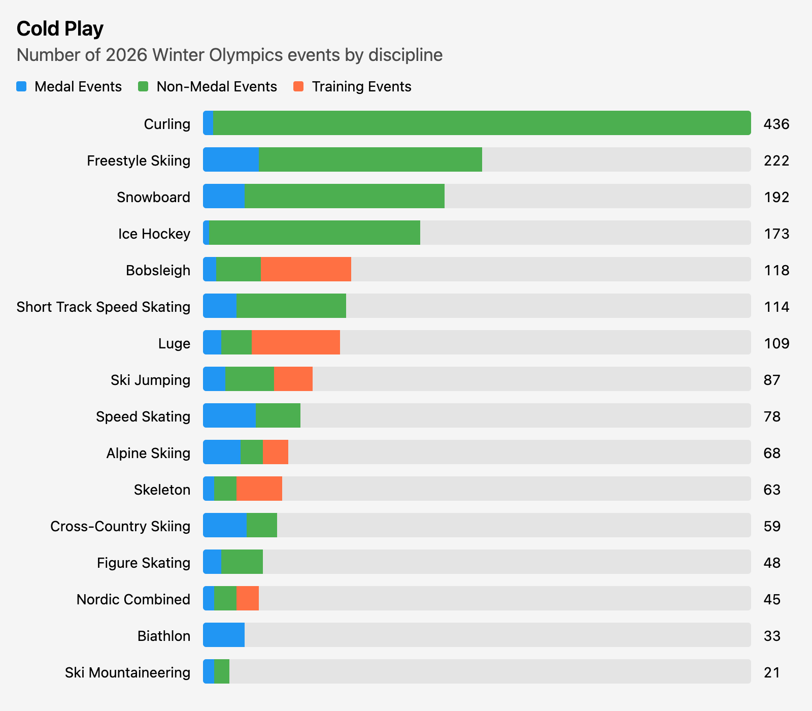 This week’s dataset is the event schedule for the Olympics. I decided to compare the number of events across sports, breaking out training and medal events.