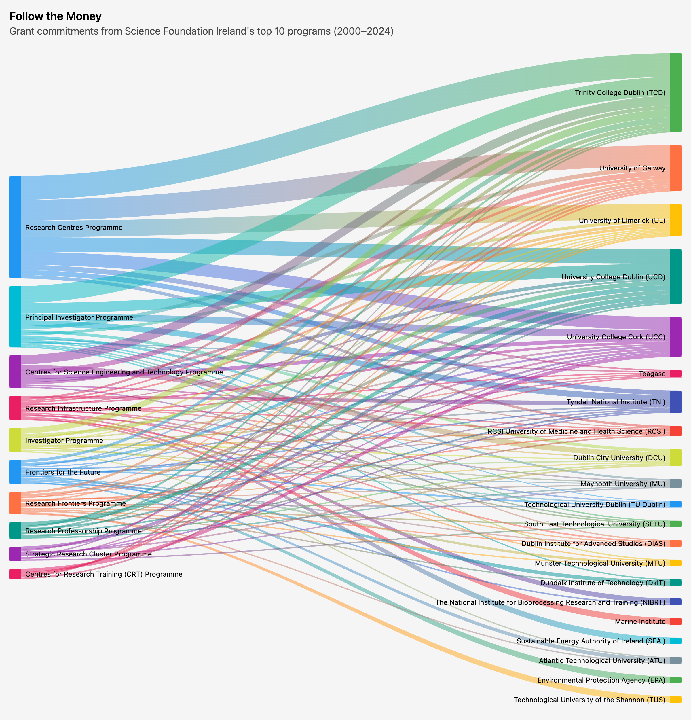 Follow the MoneyGrant commitments from Science Foundation Ireland's top 10 programs (2000–2024) Research Centres Programme → Trinity College Dublin (TCD): €231.9M Research Centres Programme → University of Galway: €203.5M Research Centres Programme → University of Limerick (UL): €159.1M Research Centres Programme → University College Dublin (UCD): €141.5M Research Centres Programme → University College Cork (UCC): €126.2M Research Centres Programme → Teagasc: €51.9M Research Centres Programme → Tyndall National Institute (TNI): €48.1M Research Centres Programme → RCSI University of Medicine and Health Science (RCSI): €33.5M Principal Investigator Programme → Trinity College Dublin (TCD): €184.7M Principal Investigator Programme → University College Dublin (UCD): €112.6M Principal Investigator Programme → University College Cork (UCC): €71.4M Principal Investigator Programme → Tyndall National Institute (TNI): €65.5M Principal Investigator Programme → University of Galway: €41.7M Principal Investigator Programme → Dublin City University (DCU): €32.0M Principal Investigator Programme → University of Limerick (UL): €30.8M Principal Investigator Programme → Maynooth University (MU): €29.4M Principal Investigator Programme → RCSI University of Medicine and Health Science (RCSI): €14.4M Principal Investigator Programme → Technological University Dublin (TU Dublin): €5.1M Principal Investigator Programme → South East Technological University (SETU): €3.0M Principal Investigator Programme → Teagasc: €1.2M Principal Investigator Programme → Dublin Institute for Advanced Studies (DIAS): €1.1M Principal Investigator Programme → Munster Technological University (MTU): €811.8K Principal Investigator Programme → Dundalk Institute of Technology (DkIT): €627.7K Centres for Science Engineering and Technology Programme → Trinity College Dublin (TCD): €95.3M Centres for Science Engineering and Technology Programme → Dublin City University (DCU): €58.1M Centres for Science Engineering and Technology Programme → University of Galway: €50.9M Centres for Science Engineering and Technology Programme → University College Cork (UCC): €38.6M Centres for Science Engineering and Technology Programme → University College Dublin (UCD): €34.5M Centres for Science Engineering and Technology Programme → University of Limerick (UL): €27.7M Centres for Science Engineering and Technology Programme → RCSI University of Medicine and Health Science (RCSI): €7.1M Centres for Science Engineering and Technology Programme → South East Technological University (SETU): €823.3K Research Infrastructure Programme → Tyndall National Institute (TNI): €47.4M Research Infrastructure Programme → Trinity College Dublin (TCD): €37.8M Research Infrastructure Programme → University of Galway: €27.7M Research Infrastructure Programme → University of Limerick (UL): €26.8M Research Infrastructure Programme → University College Cork (UCC): €25.6M Research Infrastructure Programme → University College Dublin (UCD): €17.6M Research Infrastructure Programme → Dublin City University (DCU): €10.8M Research Infrastructure Programme → RCSI University of Medicine and Health Science (RCSI): €8.4M Research Infrastructure Programme → South East Technological University (SETU): €7.7M Research Infrastructure Programme → Maynooth University (MU): €7.3M Research Infrastructure Programme → Teagasc: €5.1M Research Infrastructure Programme → Dublin Institute for Advanced Studies (DIAS): €4.7M Research Infrastructure Programme → The National Institute for Bioprocessing Research and Training (NIBRT): €4.5M Research Infrastructure Programme → Technological University Dublin (TU Dublin): €2.3M Research Infrastructure Programme → Marine Institute: €2.0M Research Infrastructure Programme → Sustainable Energy Authority of Ireland (SEAI): €690.2K Research Infrastructure Programme → Munster Technological University (MTU): €540.4K Investigator Programme → Trinity College Dublin (TCD): €76.3M Investigator Programme → University College Dublin (UCD): €44.5M Investigator Programme → University of Galway: €20.6M Investigator Programme → University College Cork (UCC): €17.1M Investigator Programme → Tyndall National Institute (TNI): €16.9M Investigator Programme → University of Limerick (UL): €15.8M Investigator Programme → Dublin City University (DCU): €12.6M Investigator Programme → Maynooth University (MU): €12.4M Investigator Programme → RCSI University of Medicine and Health Science (RCSI): €9.0M Investigator Programme → Dublin Institute for Advanced Studies (DIAS): €3.5M Investigator Programme → Teagasc: €2.4M Investigator Programme → Technological University Dublin (TU Dublin): €1.9M Investigator Programme → Atlantic Technological University (ATU): €357.7K Frontiers for the Future → Trinity College Dublin (TCD): €55.4M Frontiers for the Future → University College Dublin (UCD): €47.7M Frontiers for the Future → University of Galway: €28.2M Frontiers for the Future → University College Cork (UCC): €20.9M Frontiers for the Future → Maynooth University (MU): €12.7M Frontiers for the Future → RCSI University of Medicine and Health Science (RCSI): €12.7M Frontiers for the Future → Technological University Dublin (TU Dublin): €10.9M Frontiers for the Future → Dublin City University (DCU): €9.8M Frontiers for the Future → University of Limerick (UL): €8.3M Frontiers for the Future → Tyndall National Institute (TNI): €7.0M Frontiers for the Future → Atlantic Technological University (ATU): €4.6M Frontiers for the Future → Teagasc: €4.4M Frontiers for the Future → Munster Technological University (MTU): €4.0M Frontiers for the Future → Dundalk Institute of Technology (DkIT): €2.6M Front