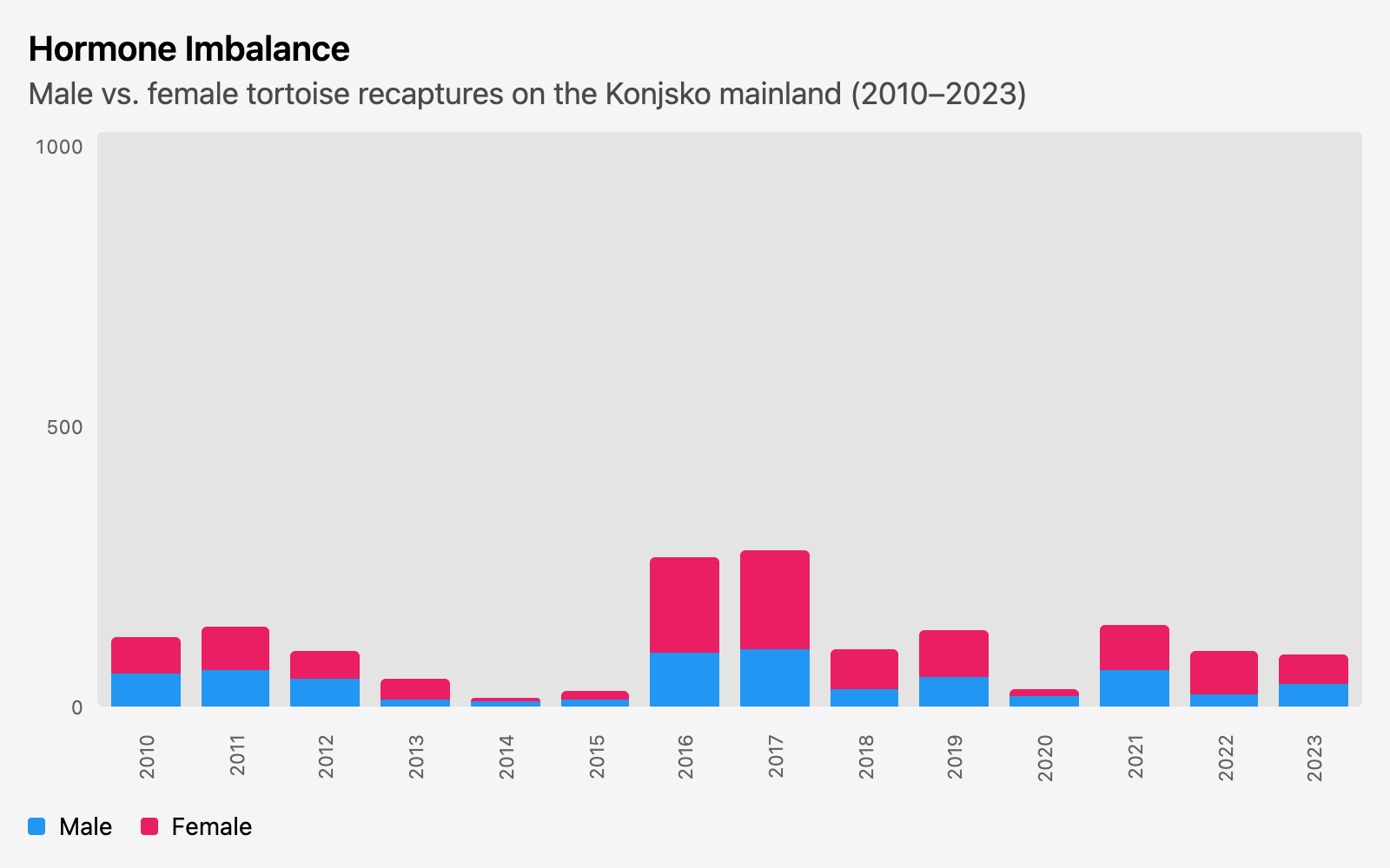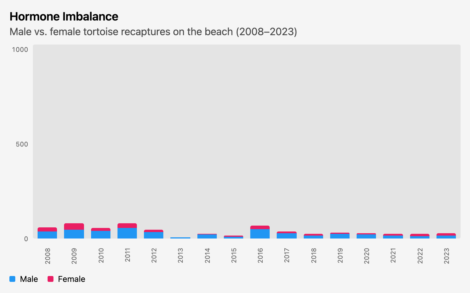 I really spun my tires on this one. Two datasets were provided—one for these recaptures with multiple body condition measurements, and one with clutch size of pregnant females. I wanted to join them since there were two tables with (presumably) a shared key for the individual animals, but the clutch size one only had 53 rows (versus over ten thousand for the other one) and there was even less overlap when I actually joined them. So just looking at the larger table, I tried all sorts of things correlating different measurements over time, by sex, in different locations…most things I tried were too busy or didn’t show much of anything. So finally I came back to this. Just a breakdown by sex, from year to year, run separately for each locality.